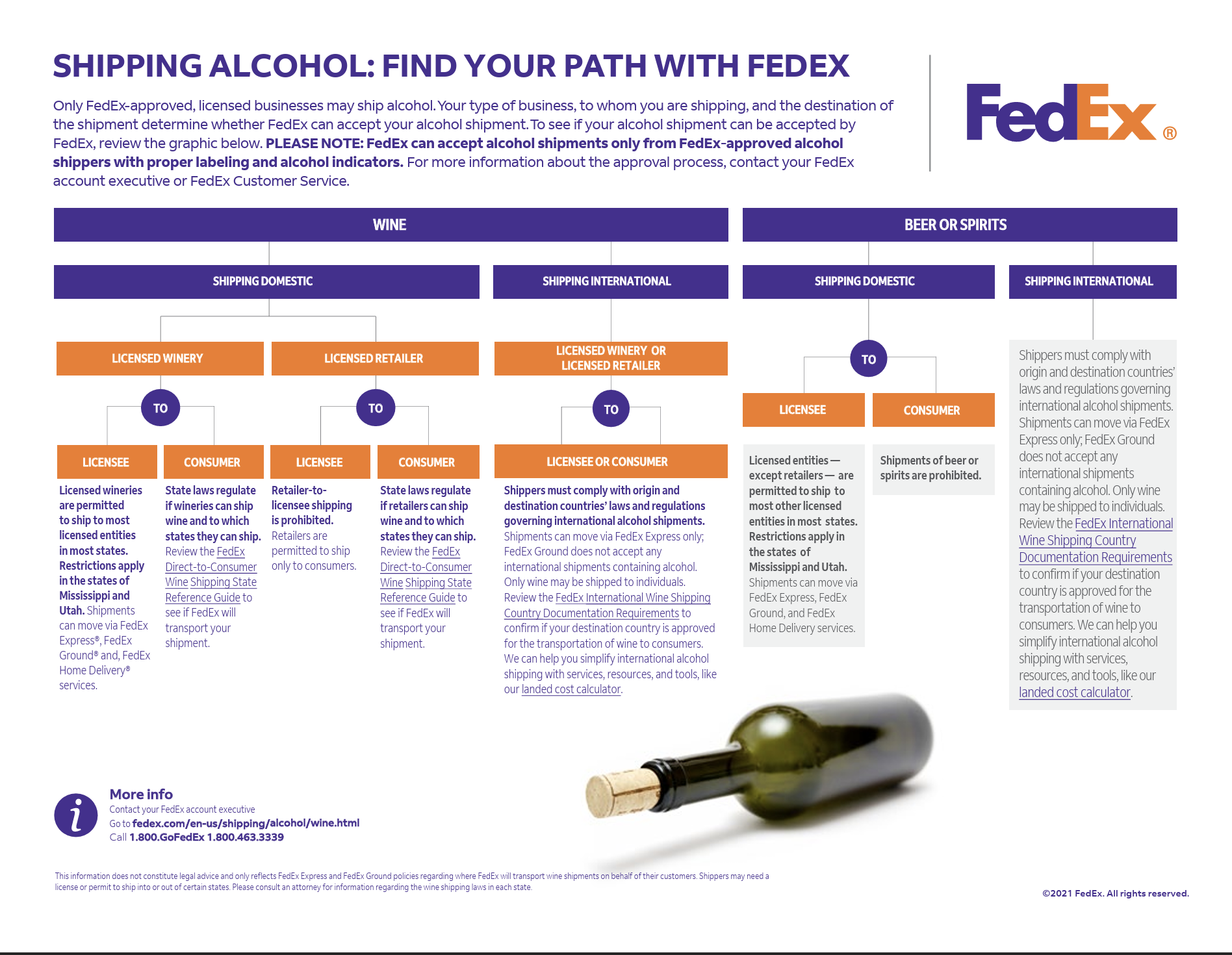 1This clarification is not legal advice. FedEx never advises Customers on legal issues concerning the shipment of alcoholic beverages. Per the terms of the FedEx Alcohol Shipping Agreement, Customers shall not tender any wine or alcohol shipment to FedEx that does not comply with all applicable laws and regulations. Customers with legal questions should contact their appropriate legal counsel or the appropriate governmental alcoholic beverage regulator.